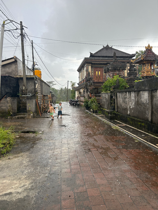 Kõikide päevade tipphetked on meil lastega olnud jalutuskäigud Pejengi külateedel. Küll kohalikud meid kiidavad kolme poja eest. Oleksid pojad balilased, oleks nende nimed Wayan, Made ja Nyoman. Saaksime ka neljanda, oleks tema Ketut (nimed pannakse siin sünnijärjekorra alusel). Eile jäime suure paduvihma kätte. Aga et õues on ju soe, 30 kraadi alla, nautisid lapsed seda kogemust väga. Eriti Maru!
